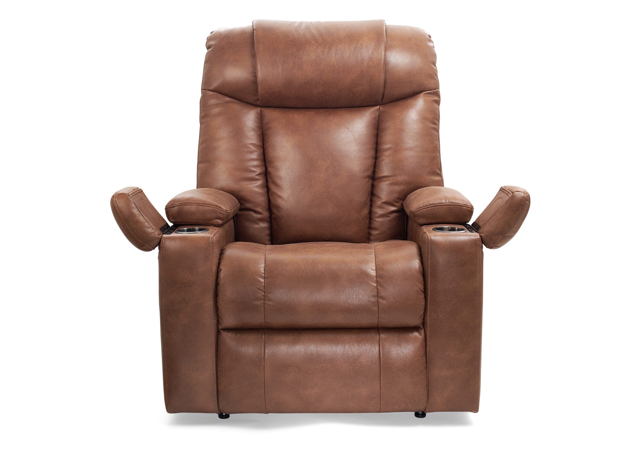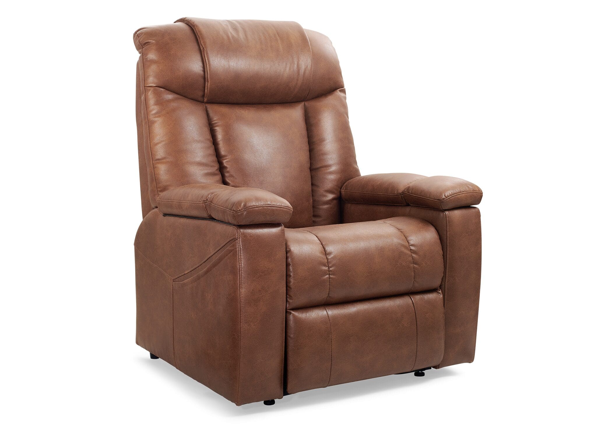The Golden Technologies®️ Rhea PR 442 is a brown leather recliner with an open storage compartment for your remote control and power ports, plus a built-in cup holder in the armrest.